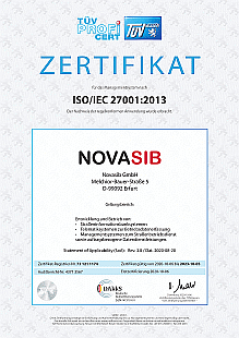 Durch die Nutzung der NOVASIB-Produktpalette schenken unsere Kunden uns seit mehr als 20 Jahren das Vertrauen, ihre analogen und digitalen Informationen vertrauensvoll und sicher zu behandeln. Den Umgang mit sensiblen Informationen hinsichtlich deren Verfügbarkeit, Integrität und Vertraulichkeit lassen wir im Rahmen der DIN EN ISO/IEC 27001 durch eine unabhängige Stelle jährlich überprüfen, leiten daraus mögliche Optimierungsansätze ab und lassen diese in die bestehenden Prozesse des Unternehmens einfließen.