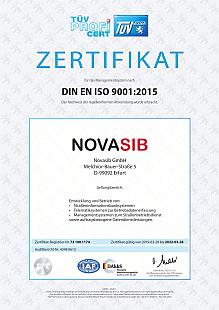 Das aktiv gelebte Qualitätsmanagement-System des Unternehmens beschreibt alle Arbeitsprozesse der NOVASIB GmbH. Das System wird kontinuierlich verbessert und bezieht auch Anregungen unserer Kunden mit in die Organisation der Arbeitsabläufe ein. Unser Unternehmen arbeitet seit dem Jahr 2000 auf Basis der ISO 9001 und ist aktuell nach DIN EN ISO 9001:2015 zertifiziert.